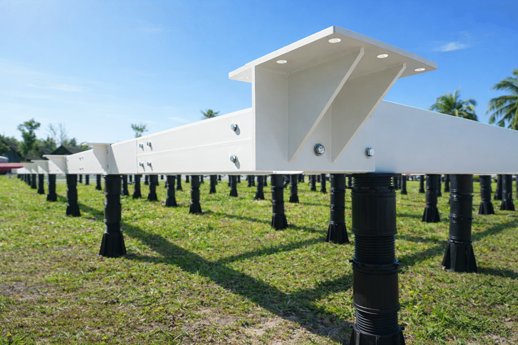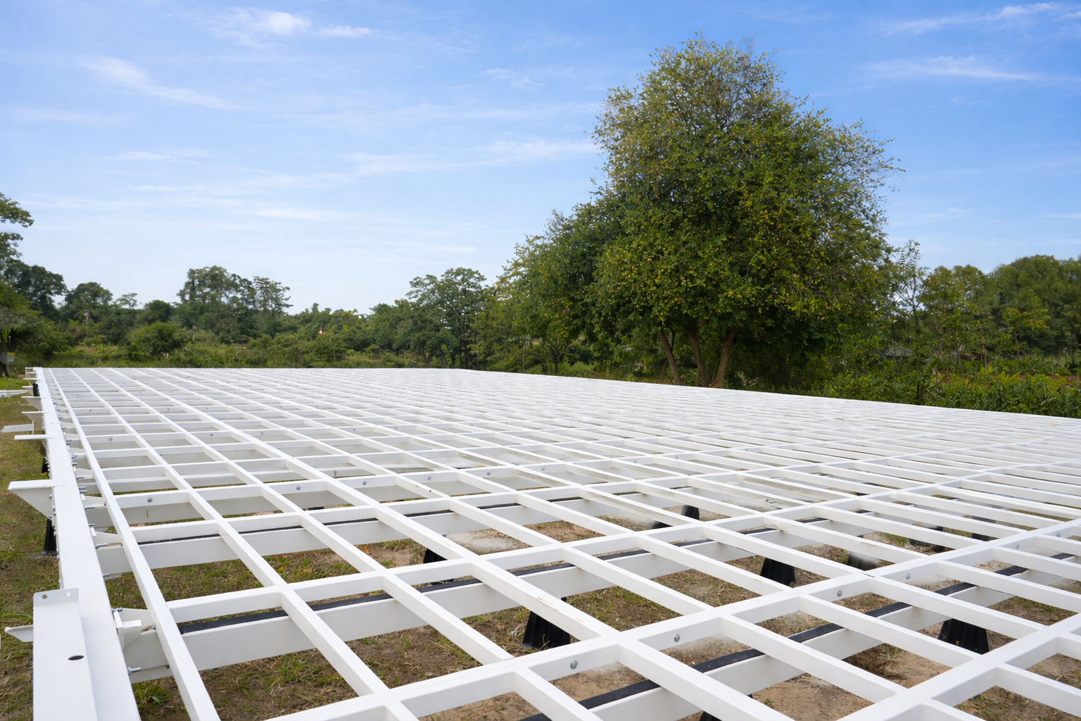 The AirPadel platform is engineered using a robust system of galvanized steel beams and adjustable support legs, creating a rigid and level base that distributes loads evenly across the structure. The modular beams interlock to form a strong structural grid, while the adjustable legs allow precise leveling on uneven terrain, ensuring the playing surface remains perfectly aligned regardless of ground conditions. This design eliminates the need for permanent civil works while still meeting the structural requirements of a professional padel court installation.