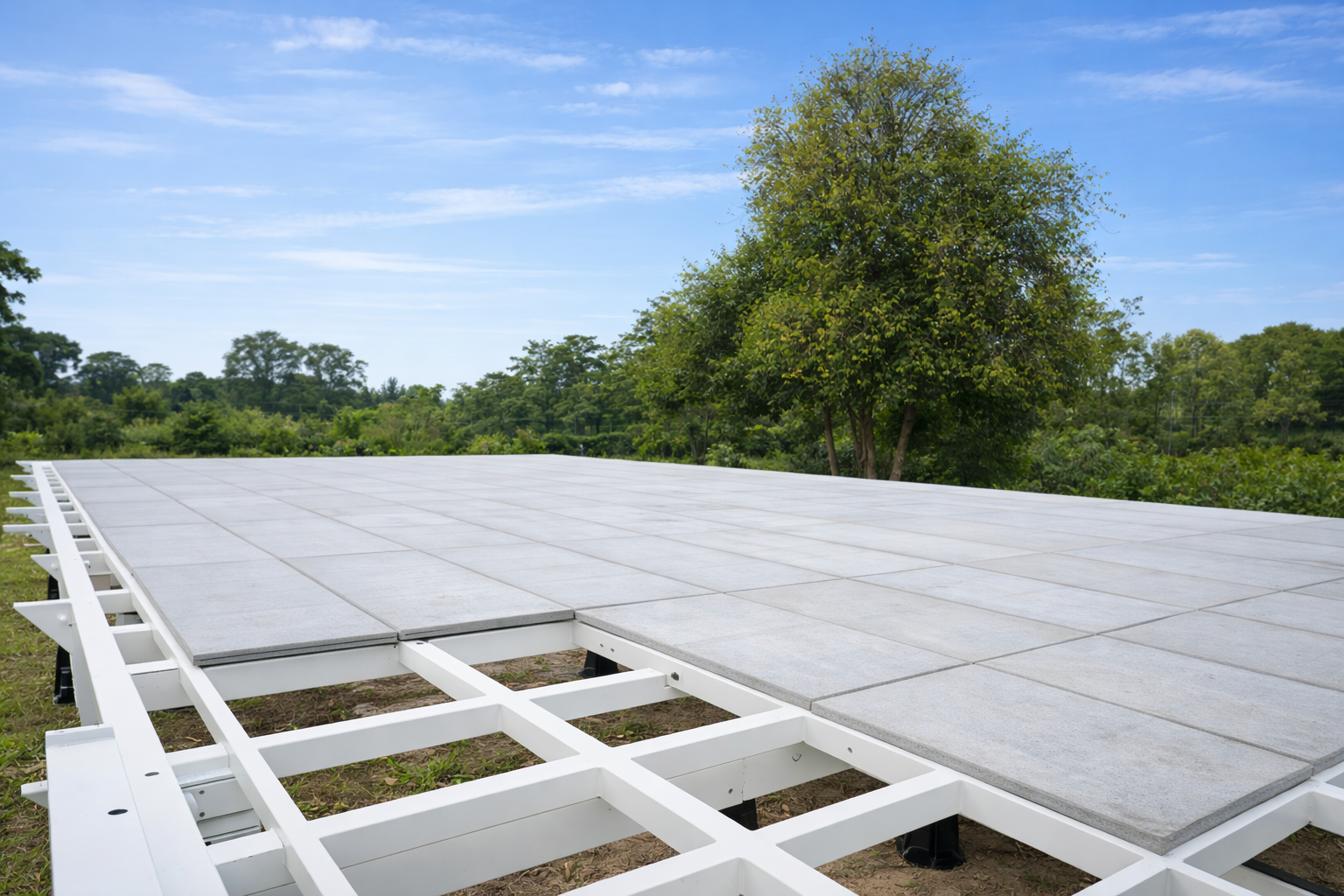 Above the structural beams, the platform incorporates reinforced concrete panels that create a solid and uniform base for the turf and court structure. This system provides approximately 99% of the playability of a traditional concrete-based padel court, ensuring consistent ball rebound and a professional playing feel. At the same time, the modular platform introduces a slightly softer impact absorption, which helps reduce stress on players’ joints and knees, contributing to improved comfort and lower risk of impact-related injuries during play.